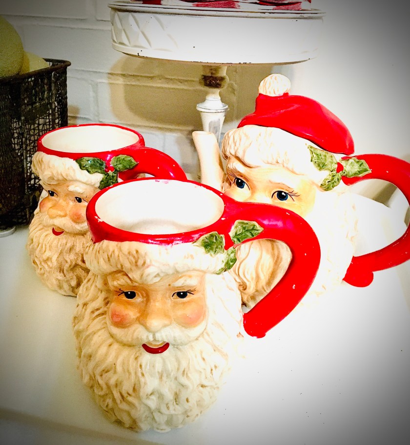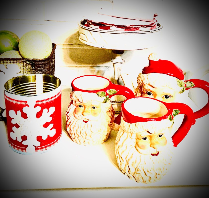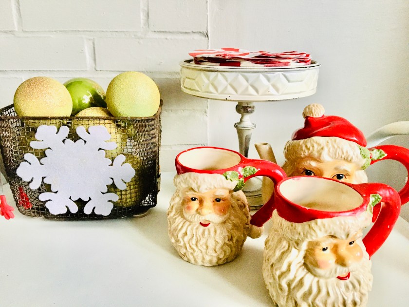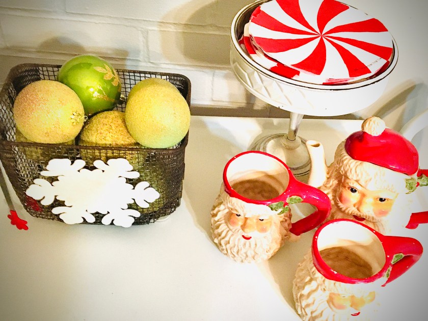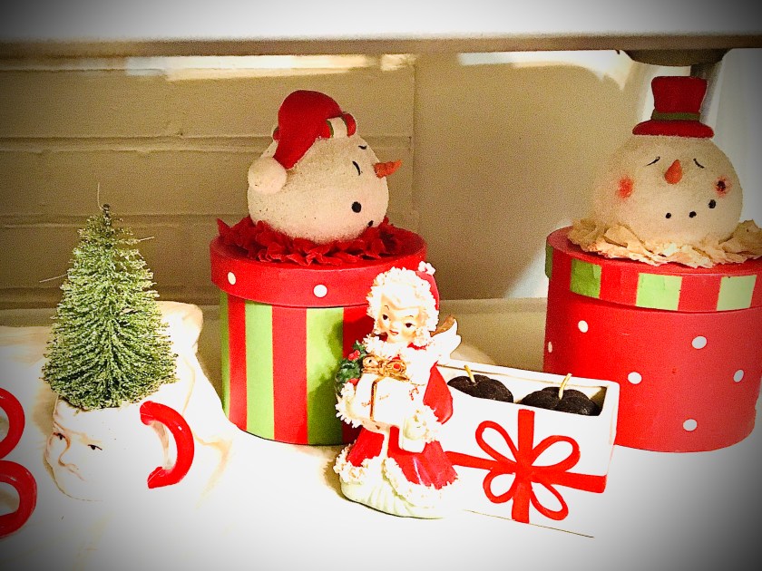 Vintage Christmas girl, Snowman containers. (Yep, that’s a brick wall in my my kitchen. My house is about 115 years old now. She looks as young today as she did then. 🙂 )